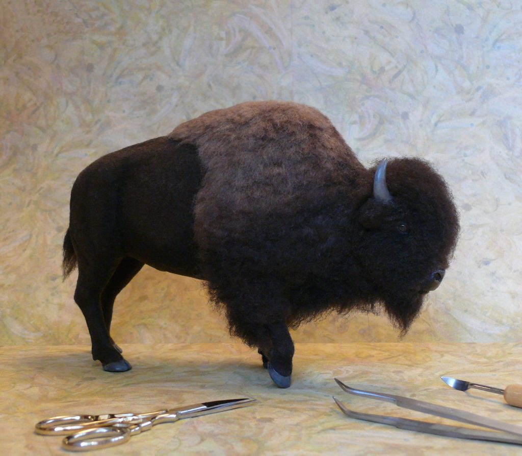 Finally, the sculpture is ready for its most challenging step – its coat of fur (usually alpaca fiber and sheep wool, but sometimes more exotic fibers, or synthetic depending on the fur type of the animal that is being made). It is applied a tiny bit at a time with tweezers and adhesive, and the fur must be applied carefully in the growing direction for a realistic look. This step takes the longest as the glue for the different layers of fur need to dry before applying more to the next area, along with precise trimming of the coat during and after application.